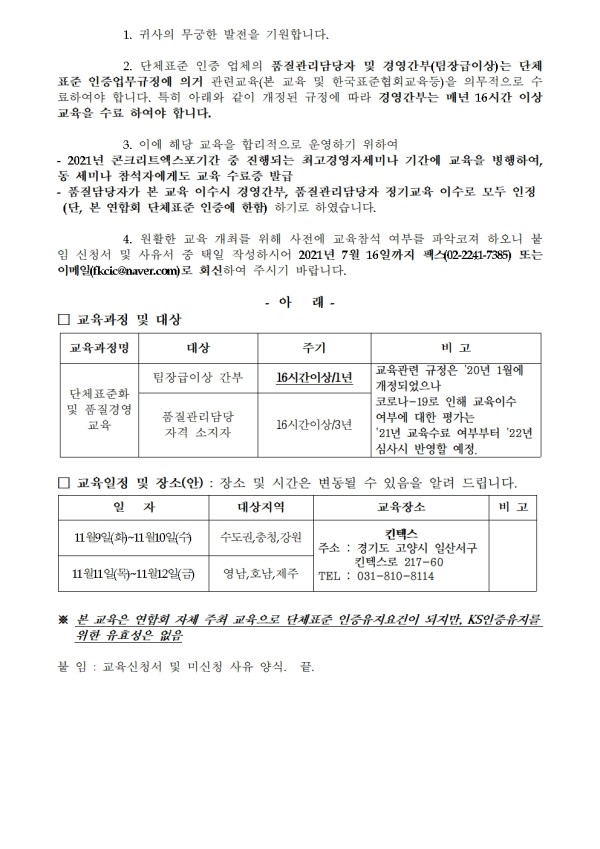 단체 2021년도 단체표준화 및 품질경영 교육 신청 안내 게시글 작성정보 작성자 한국콘크리트공업협동조합연합회 작성일 21-07-01 16:23 조회수 1,342 댓글수 0 목록 게시글 본문 . 첨부파일 2개 1001.jpg (557.2K) 0회 다운로드 첨부일시 : 2021-07-01 16:23:05 붙임._교육신청서_및_미신청_사유_양식_1.hwp (71.0K) 0회 다운로드 첨부일시 : 2021-07-01 16:23:05 이전글 단체표준 인증 취소업체 공지 : (유)대관산업 21-07-30 다음글 단체표준 인증 자진반납 업체 공지_양지콘크리트(주) 21-06-28 댓글 0 등록된 댓글이 없습니다. 목록