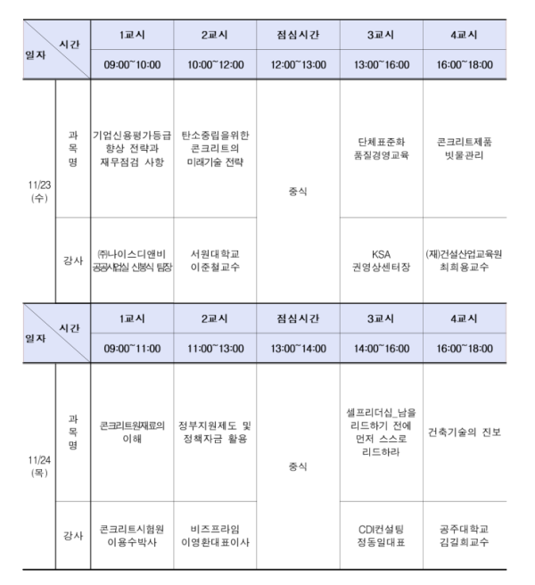 - 교육내용 : 콘크리트 미래기술, 콘크리트제품의 빗물관리, 표준화관련, 경영간부 리더십, 제조업 산