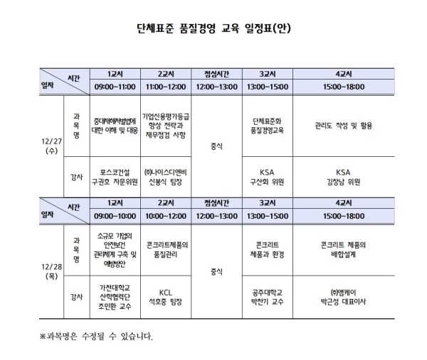 □ 교육내용 : 콘크리트 제품 관련(품질관리, 배합설계), 표준화 관련, 경영간부 리더십, 관리도 작성 및 활용 등
