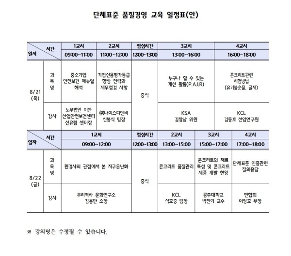 □ 교육내용 : 콘크리트 제품 관련(품질관리, 배합설계, 시험방법), 중대재해처벌법 및 안전체계구축, 개선활동방법, 인문학강의 등