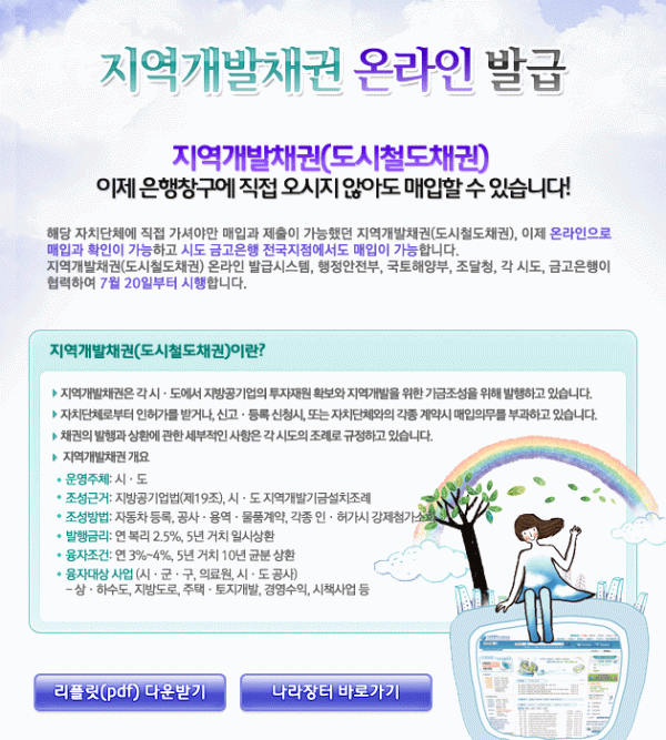 행정안전부, 국토해양부, 조달청, 각시도, 금고은행이 협력하여 중소기업이「시도 지역개발기금설치조례」와 관련하여 지역개발채권(도시철도채권)의 매입과 매입필증 제출을 위해 해당 자치단체를 직접 방문해야 하는 불편을 해소하기 위하여「지역개발채권(도시철도채권) 온라인 발급시스템」을 개발구축하여 7월 20일부터 시행할 계획임을 알려드리오니 업무에 적극 활용하시기 바랍니다.