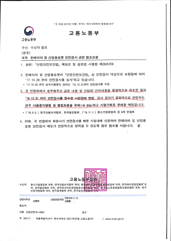 3. 이에 고용노동부에서 별첨과 같이 건의내용에 대한 검토결과를 회신하여 왔기에 알려드리오니 참고하시어 컨베이어 안전검사를 신청하시기 바랍니다.