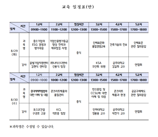 □ 교육내용 : 콘크리트 미래기술, 표준화관련, 경영간부 리더십, 제조업 산업안전 보건 등