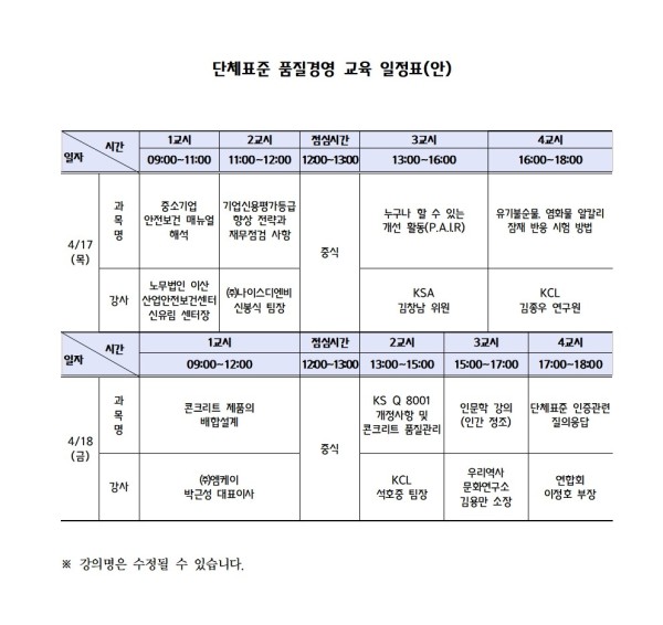 ※ 상기 교육 수료증은 KS 심사시에 평가하는 매3년 법정교육에 인정되지 않으니, 단체표준, KS 병행인증업체 중 3년 주기에 해당 하는 업체는 한국표준협회 교육을 수료 하시기 바랍니다. 특히 상기 품질관리담당교육은 KS인증 없이 단체표준만 인증 유지하는 업체에 해당 합니다.