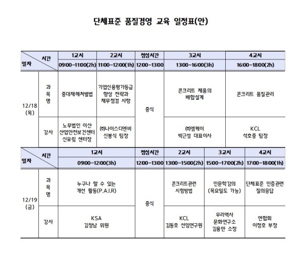 □ 교육내용 : 콘크리트 제품 관련(품질관리, 배합설계, 시험방법), 중대재해처벌법 및 안전체계구축, 개선활동방법, 인문학강의 등